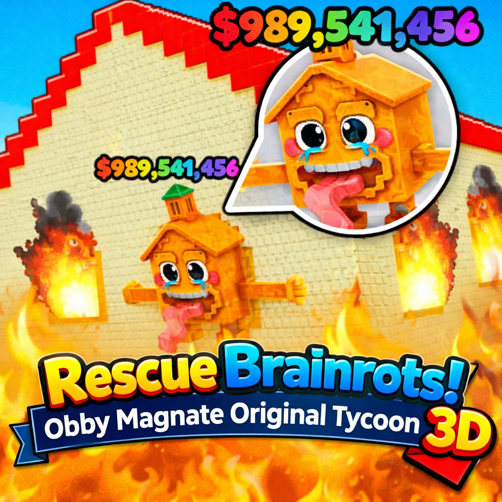 Rescue Brainrots! Obby Magnate Original Tycoon 3D begins amidst chaos. Tiny Brainrots scream for assistance; traps lurk as flames sweep throughout the tower.